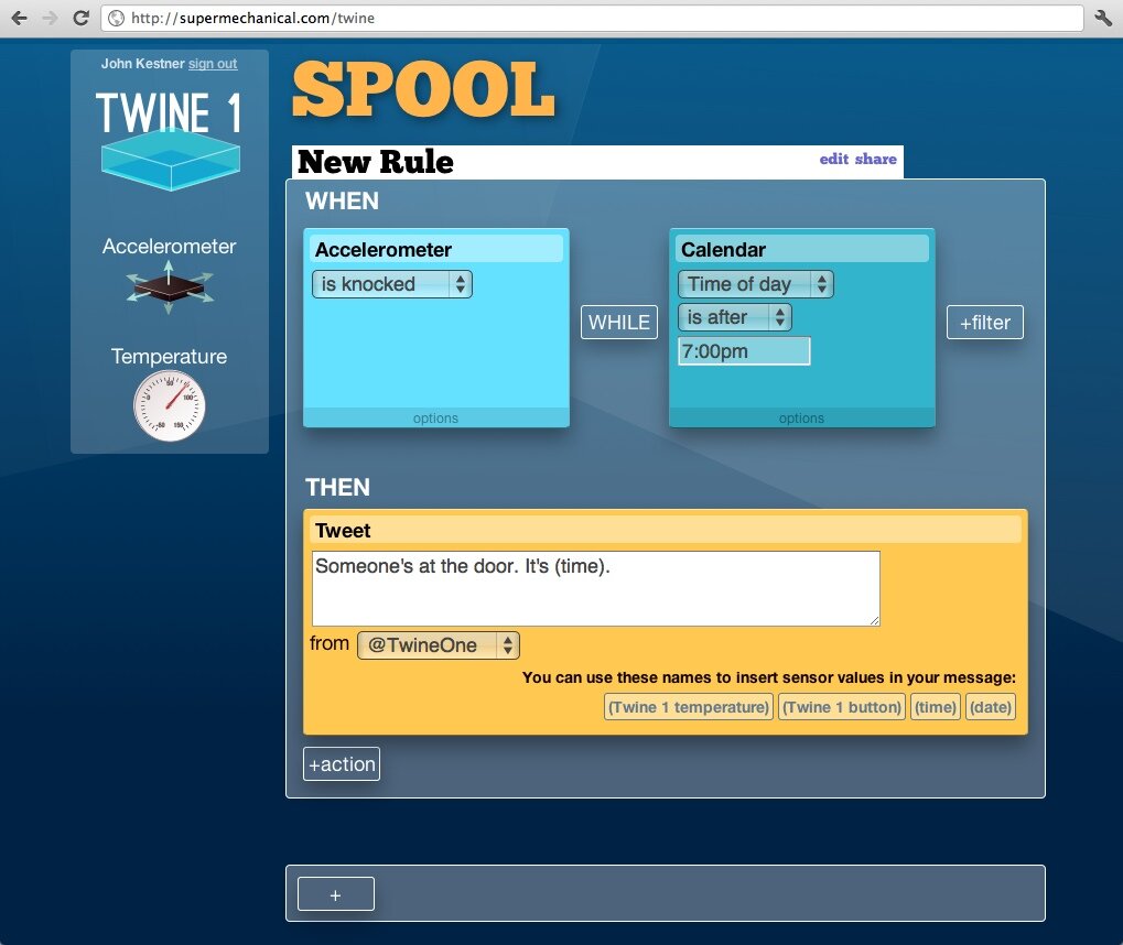 Their explanation is a bit verbose and difficult to understand, so I’ll break it down for you. The Twine square is powered either by USB or batteries, and comes with both temperature and vibration sensors. You can also buy other sensors (ex: moisture sensor) to use as well. Twine connects to your home Wifi wirelessly. Once connected, you can use a web app to set rules for what you want your Twine to tell you about. It can text, tweet, or email to talk to you. And you can have it do whatever you want - no difficult programming required, only a couple of dropdown options to select from online.