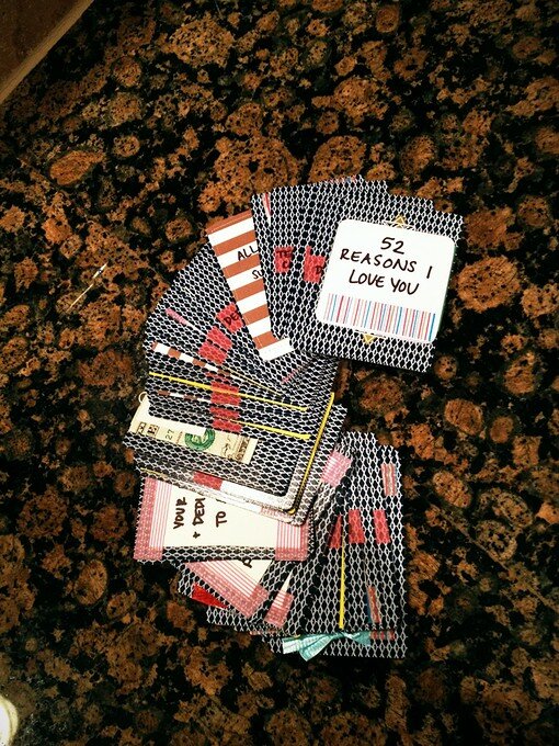 I gave this gift to my dad for his 52nd birthday and titled it "52 Reasons I Love You". Here is a photo he took when he opened up the package in the mail. Not shown in the video, I also did a few other creative things with these cards. For instance, on one, I attached a dollar bill with a paper clip and a note that said: "For all the money you've ever spent on me." On another, I cut out a photo of me and him and adhered it to the card. You get the picture - there are all kinds of ideas you can come up with! And, needless to say, it was a success. My dad absolutely loved it.