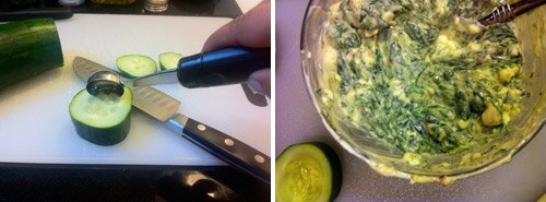 Cut cucumbers slices about 1 inch thick. Use a melon baller to scoop out inside and create a perfect little cup. For the creamy (but healthy) dip, we use a combination of fat free Cream Cheese and nonfat Greek Yogurt for a great mix of creamy and tart. Use about 3 tbsp of cream cheese and 1 cup of yogurt and whip together. Remove the spinach from the fridge and add to the mix.
