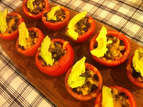 Place tomato cups on a small cookie sheet and fill with your black bean corn sauté. Add a sprinkle of shredded cheddar on the top and bake for 15 minutes.
