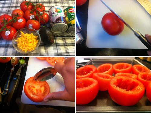 While the filling is heating up, wash your tomatoes and remove from the vine. Cut off the tops and scoop out the middle with a spoon. (We suggest saving the tops and middle, dicing ‘em up, and making yourself a Bloody Mary on the side).
