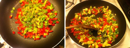 Use your finger to dab olive oil on the edges of the polenta pots. Then place on a cookie sheet face down and bake for 5 minutes. While the polenta pots crisp up, take your peppers off the stove and place in a mixing bowl. Add ½ cup of freshly grated parmesan and additional salt and pepper to taste.