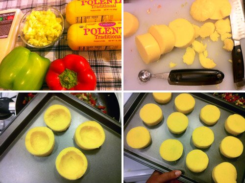 While all these veggies are heating up, it’s time to tackle the polenta. Cut the polenta tube into 1-inch slices. Scoop out a cup form using our favorite tool, a melon baller. Save the discarded polenta for another recipe, perhaps a simple polenta, mushroom, spinach sauté with sun-dried tomatoes.