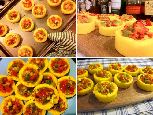 Who doesn’t love a little alliteration? These Peppery Polenta Pots are more than a tongue twister, they’re a great self-contained appetizer that pack a flavorful punch. If you haven’t experimented with pre-made polenta, it is time to start. Homemade is always best, but I love the firmness of the polenta in a tube. It’s great for grilling, baking, sautéeing, and just about everything. Plus, its fat free and gluten free!