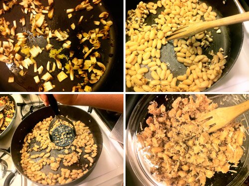 Drain and rinse white beans. Add beans to the mushroom garlic mix and heat on medium uncovered. Add crushed walnuts and continue to sauté. After a few minutes, grab your trusty nylon potato masher (you can use metal if your sauté pan is metal, but the softness of nylon is preferred) and mash up your white bean stuffing allowing it to singe a little bit on the pan.