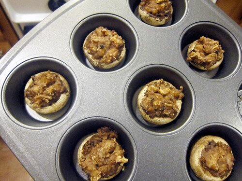 Remove stuffing from heat, and place in mixing bowl. Mix in the parmesan. Spoon the stuffing into the mushroom caps and bake for 15 minutes.