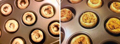 Scrub your mushrooms with a mushroom brush. Pull out the stems and set a few aside. Dab the tops (the not scooped-out part) of each mushroom with a drop of olive oil, and set scoop side up in a cupcake pan. Using a cupcake pan isn’t crucial, but is nice for absorbing all those delicious mushroom juices and ensures that mushrooms stay in their upright and locked position. ;)