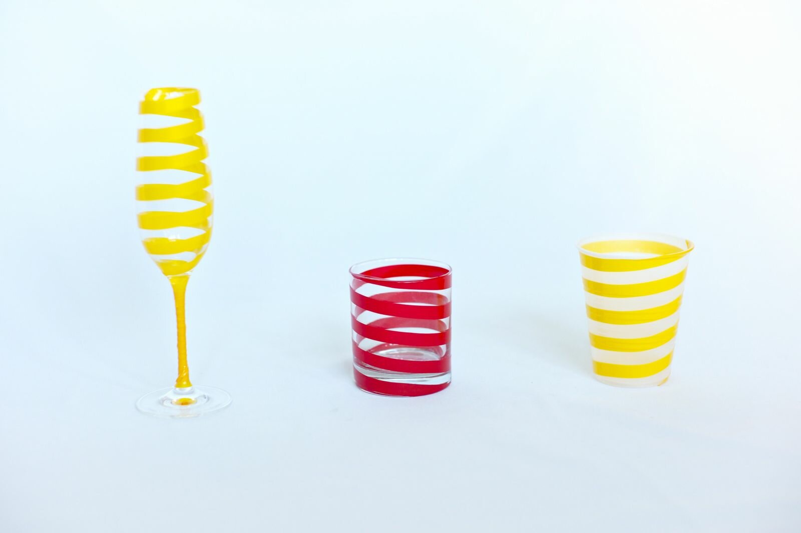 It’s as easy as it looks. Just use your electrical tape to wrap your glass in a spiral pattern, starting from the bottom and finishing up top. Leave enough space in between each line as the tape is thick to ensure symmetry. If painting wine or champagne glasses, wrap the entire stem as well.