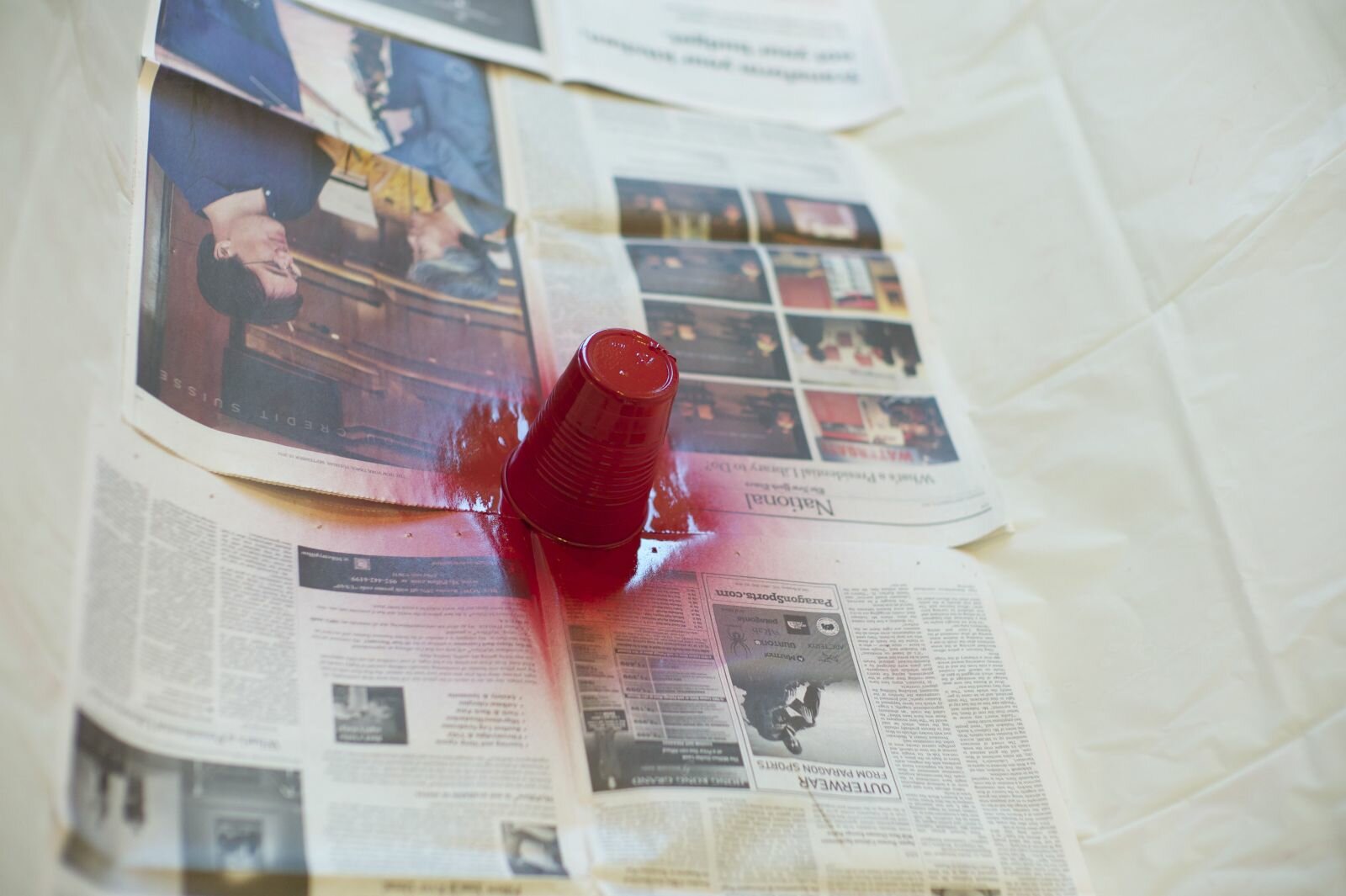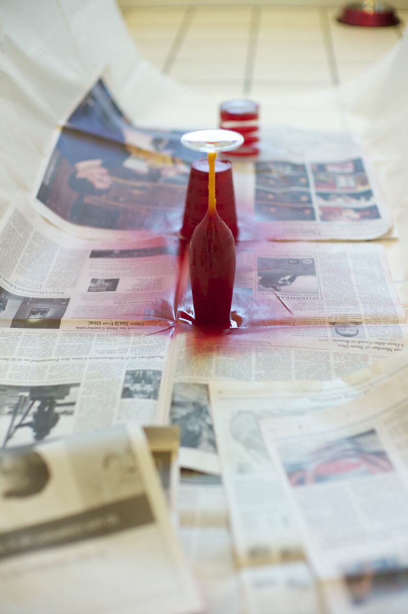 Once wrapped, place on the ground outside or on newspaper and spray paint, holding the can six inches away. You’ll probably want to do two coats to ensure a bold color. For wine or champagne glasses, be extra careful not to spray the bottom - the wrapped stem helps to avoid this.